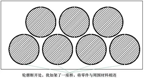 利用桥位(微连接)切割工艺,可避免发生此种现象。在对图形进行激光切割编程时,有意将封闭的轮廓,断开若干处,使得切割完成后零件与周围的材料粘连在一起,不致掉落,这些断开处,就是桥位。也称为断点,或微连接(这种叫法源自对MicroJoint的生硬翻译)。断开的距离,约0.2~1mm,与板料的厚度成反比。基于不同的角度,有了这些不同的叫法:基于轮廓,断开了,所以叫断点;基于零件,与母材相粘连,所以叫桥位或微连接。
